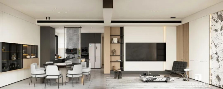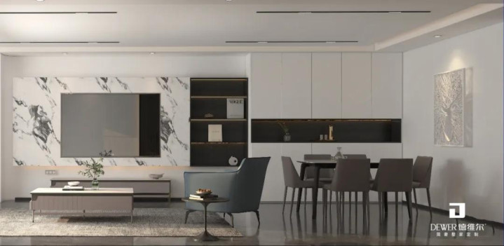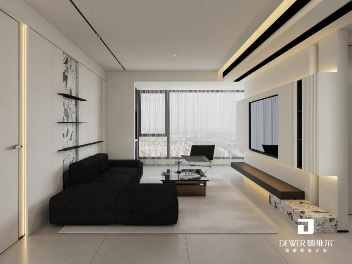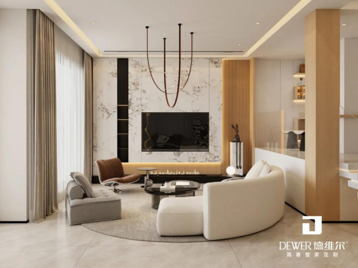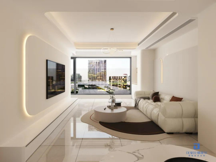 客厅以柔和的杏白铺陈,构筑舒缓放松的视觉基调。悬浮电视背景墙、异型沙发背景墙搭配线性灯带,以极简笔触拉伸空间维度,暖光漫射间,将温馨氛围无限放大。