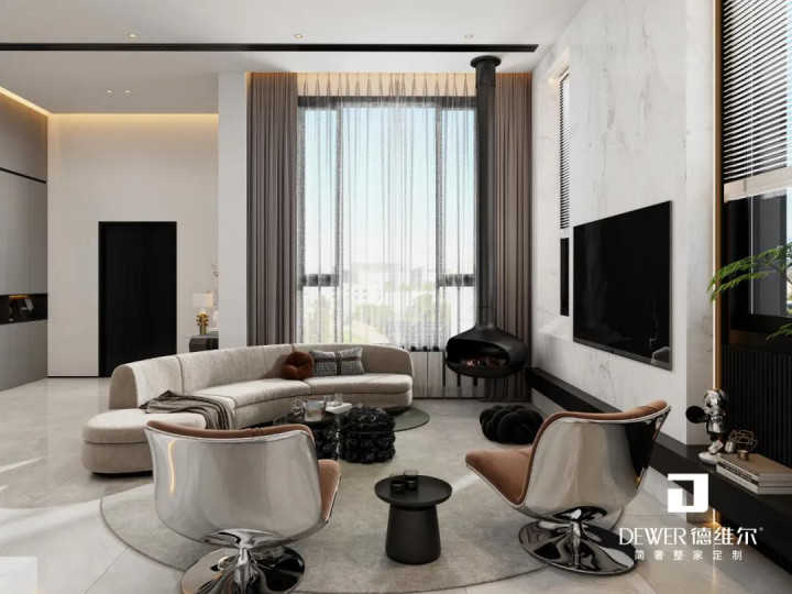 大胆又独特的客厅设计,抛弃了繁琐的造型,悬空的电视柜,兼具展示收纳;灰色系的圆弧沙发,带给人优雅、愉快和轻松氛围,为家增添画龙点睛艺术美感。