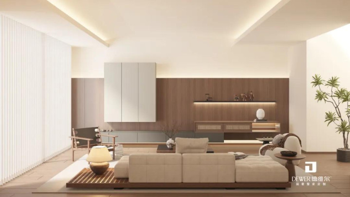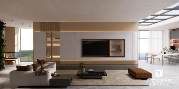采用简洁的线条和几何形状,创造干净利落的视觉效果,中性色调以及藤编等自然材料,营造出温馨而不以电视为中心的氛围。