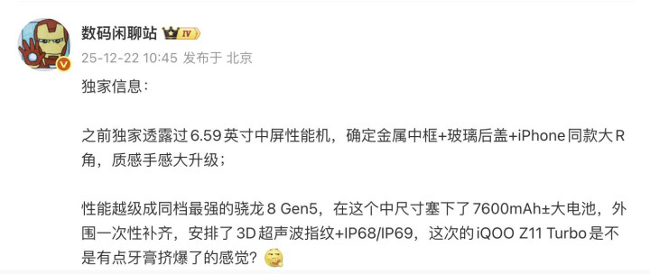 iQOO Z11 Turbo采用6.59英寸中直屏,可以兼顾大电池和更好的散热,适合喜欢游戏的小屏旗舰用户,同时带来了iPhone同款的大R角设计。机身内置7600毫安时电池,搭配第五代骁龙8旗舰芯片,续航体验将会有一个明显的提升,这也是让亓纪最心动的硬件配置。