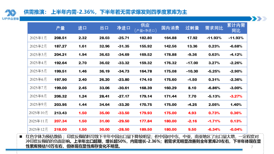 2025年和后期投产计划:新浦化学50W(已投);海湾化学20W(8月投投);金泰30W(4月投), 渤海发展40W(9月投),福建万华50万(8月投), 甘肃耀望30W(9月投),嘉化30万9月试产,但可能延迟投产。全年预计230-250万。 |